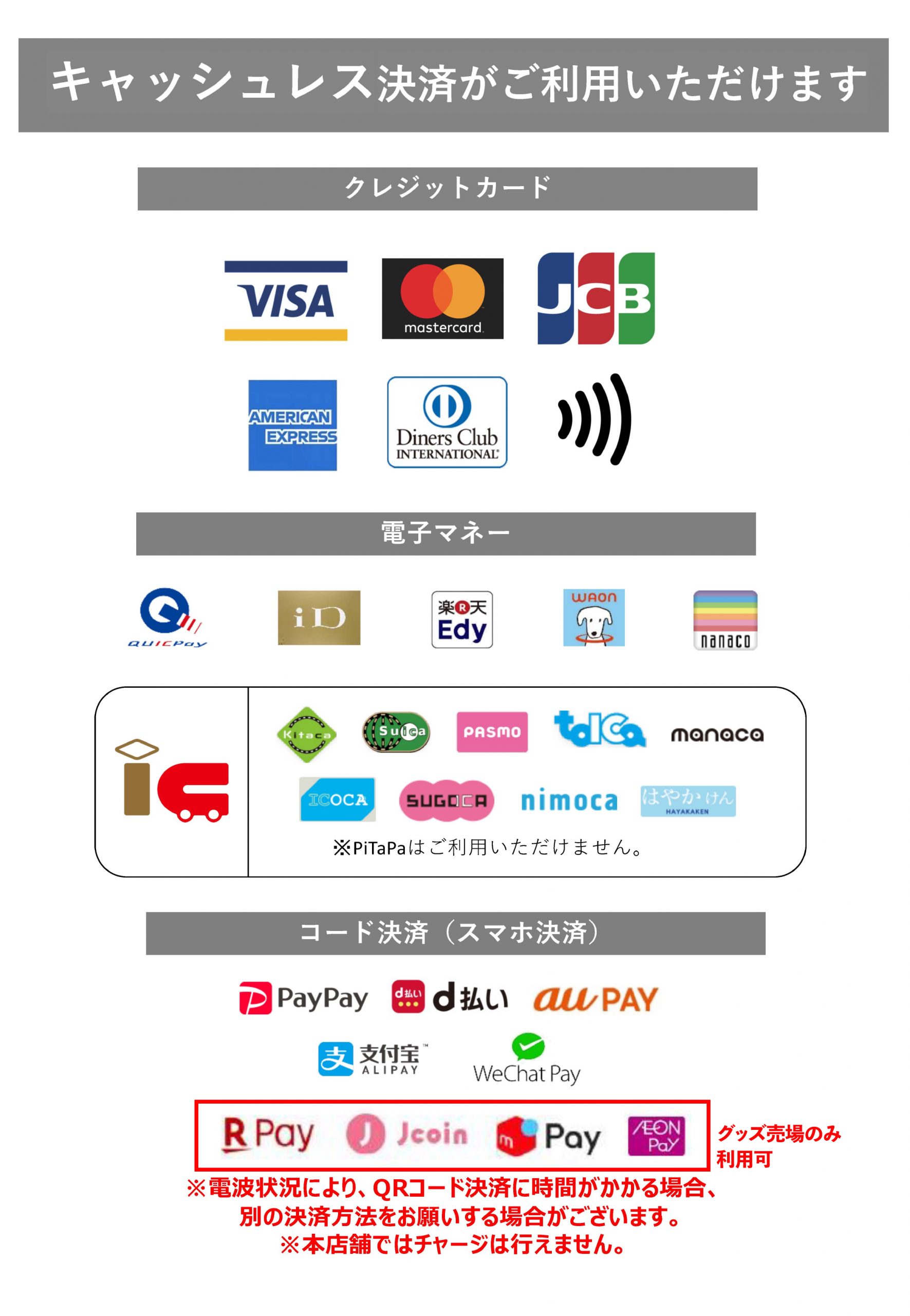 電波状況により、現金支払の方がスムーズな場合もございます。状況に合わせて使い分けられるよう、ご準備いただけますと幸いです。