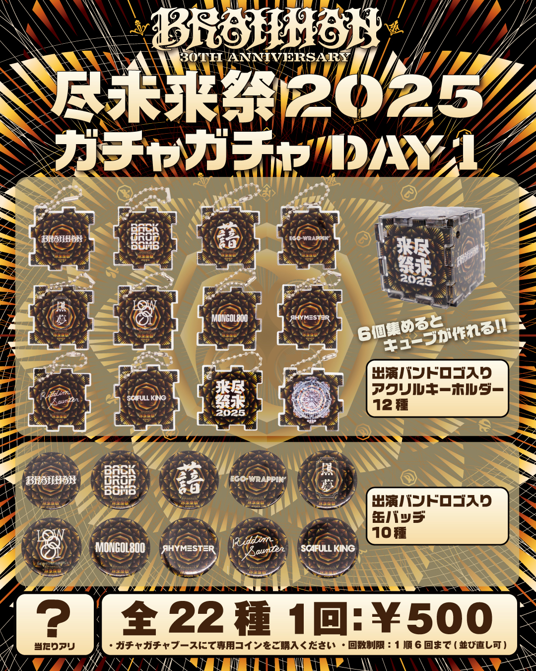 6個集めるとキューブが作れる面白仕様のアクリルキーホルダーや、出演バンドの缶バッジがラインナップ!